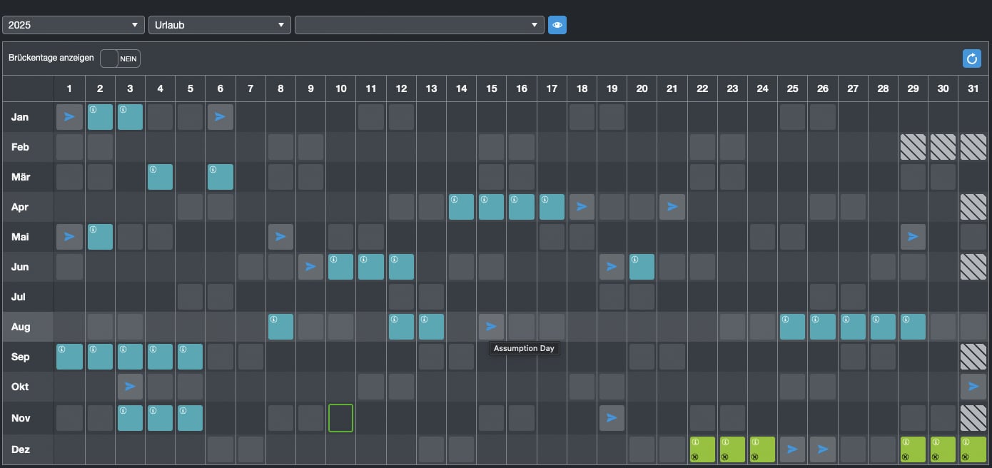So kann das System Feiertage in der Planung wie reguläre arbeitsfreie Tage berücksichtigen – ohne dass der Benutzer manuell eingreifen muss.
